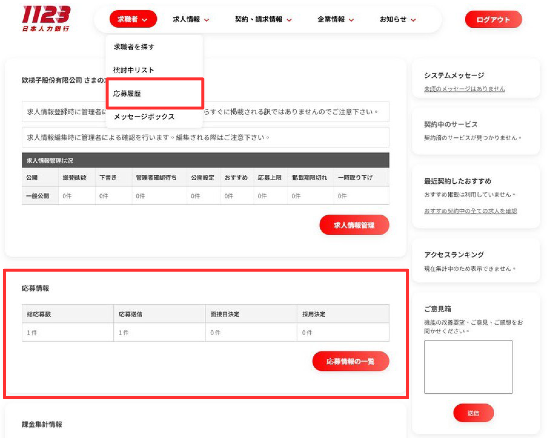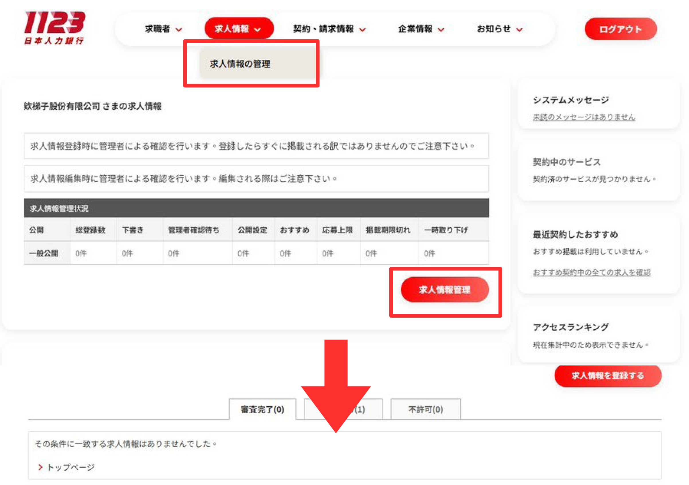 •求人情報管理をクリックして、 求人情報管理ページに進みます