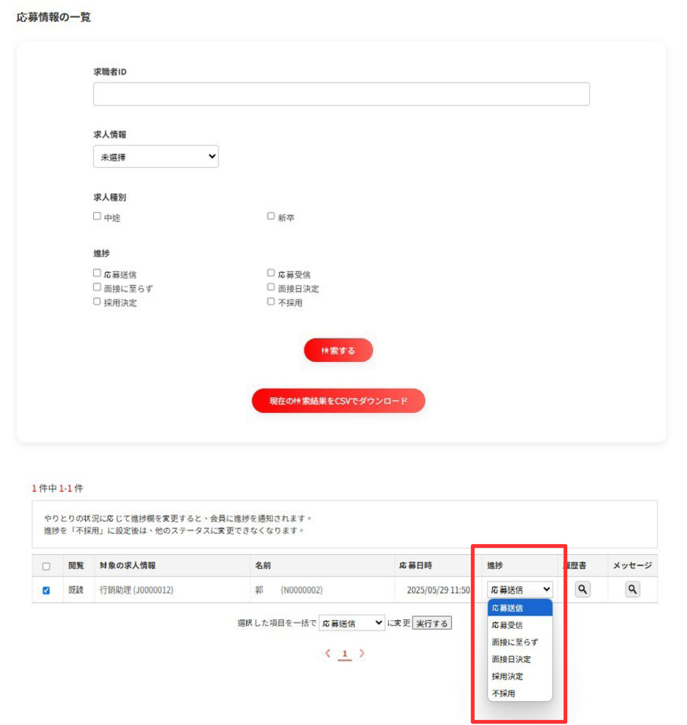 •【 応募履歴】 または応募情報から、 現在の応募状況を確認できます