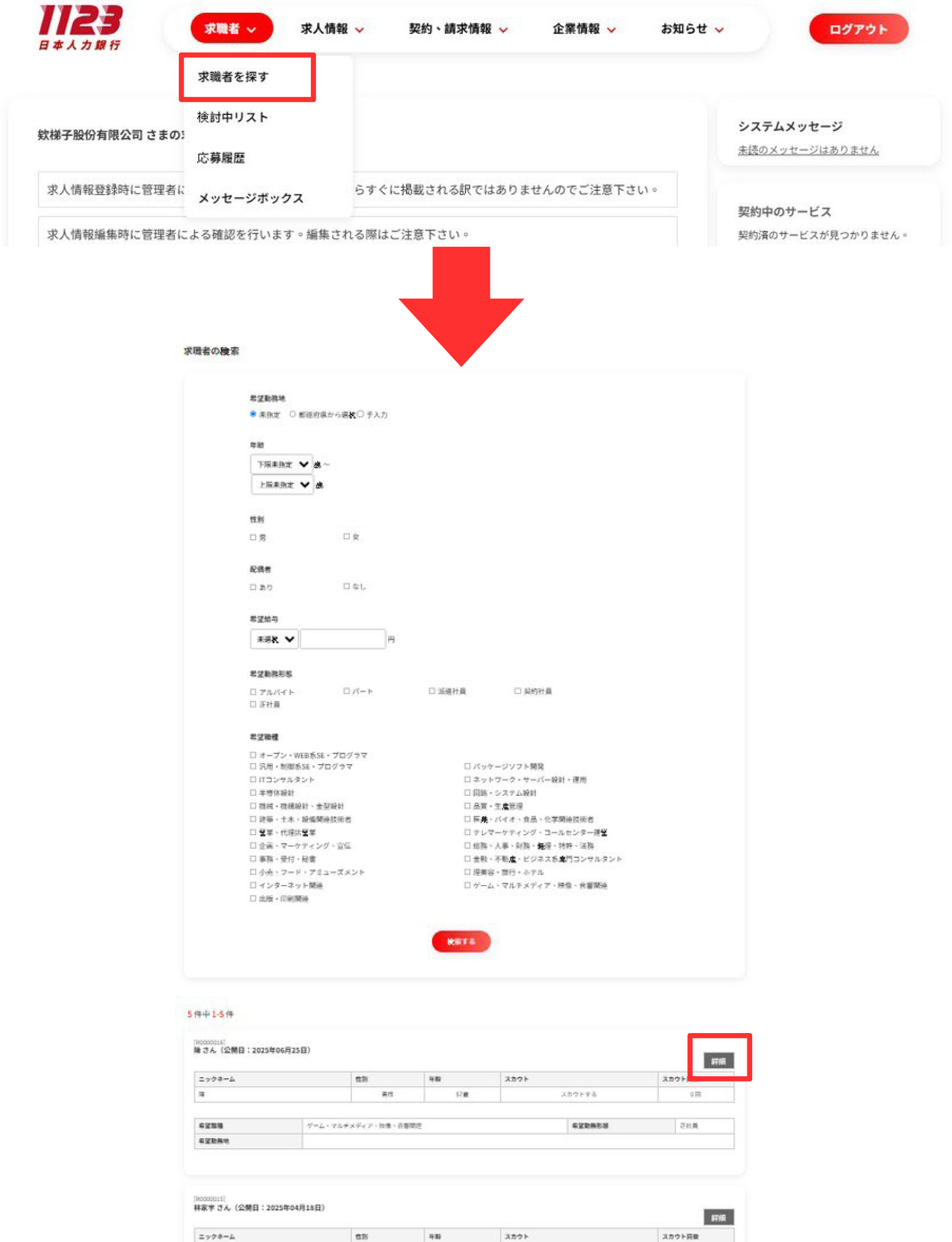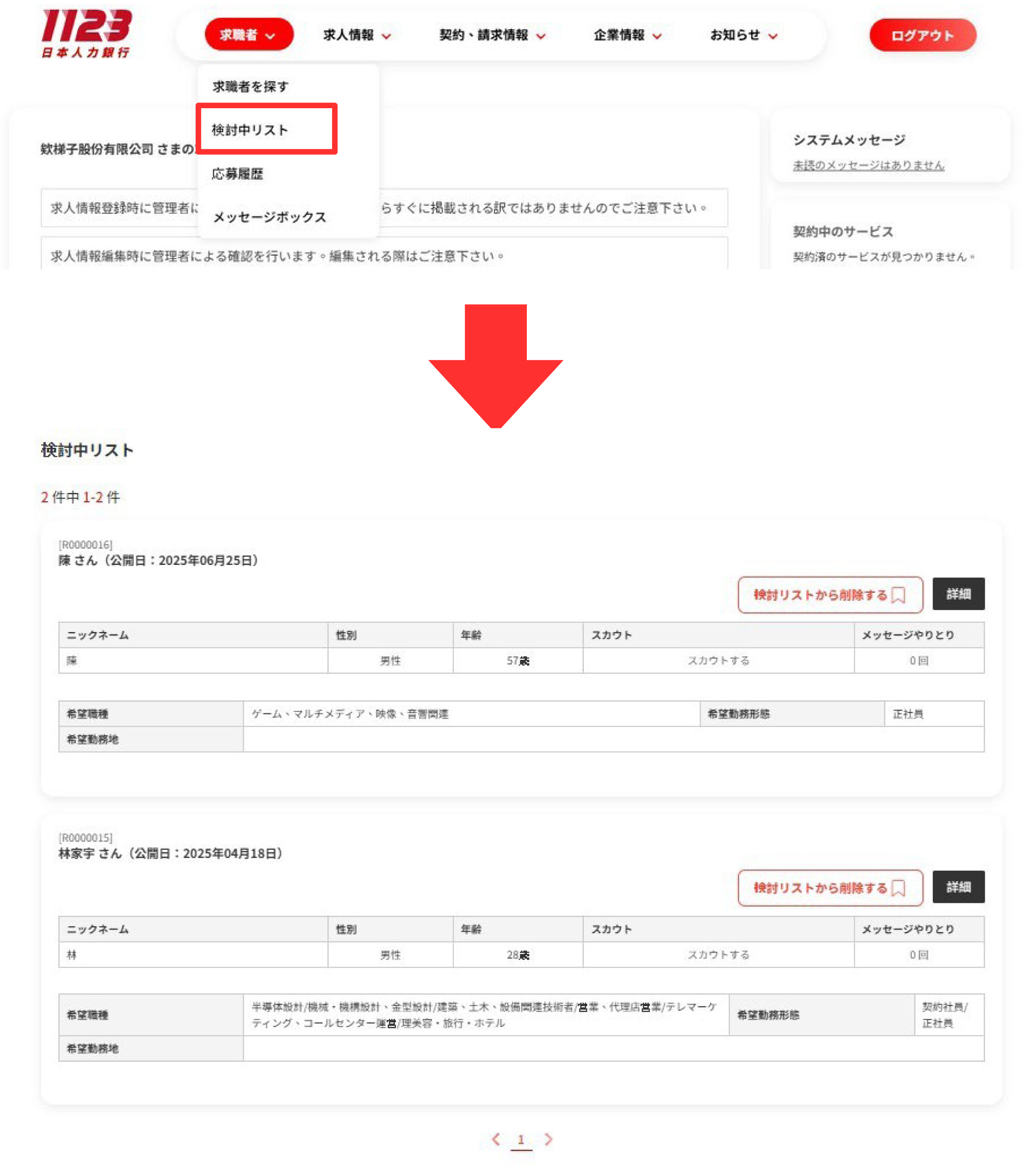 •条件に合う求職者を検索し、検討リストに追加することができます