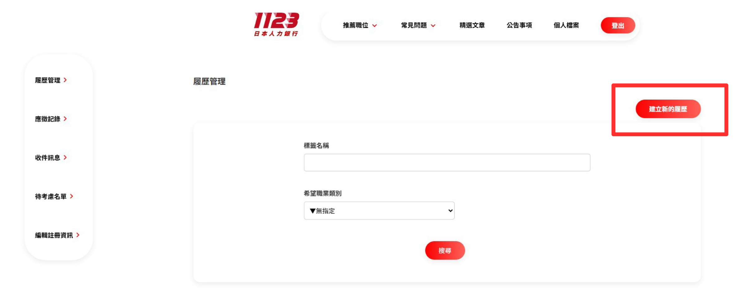•點擊右上角按鈕建立新履歷
